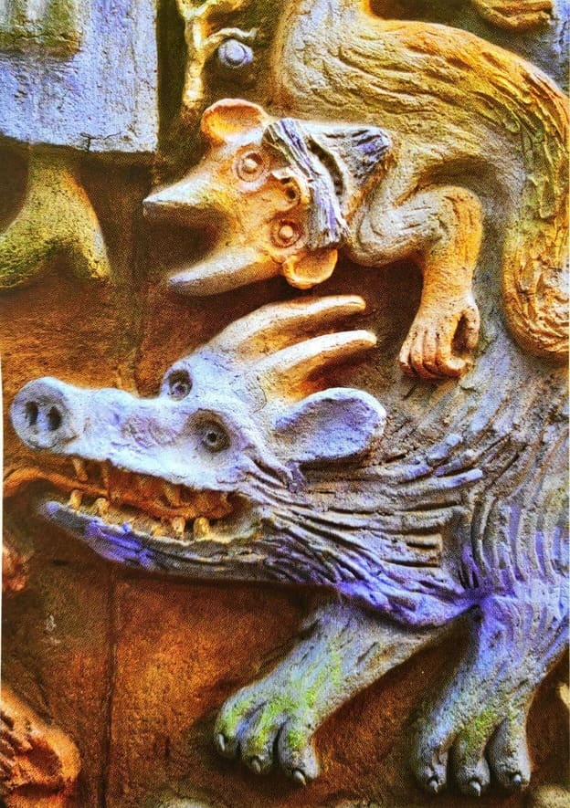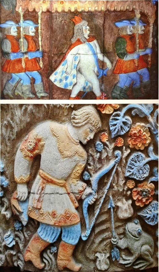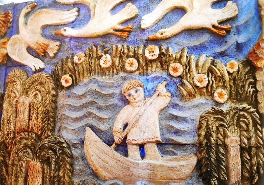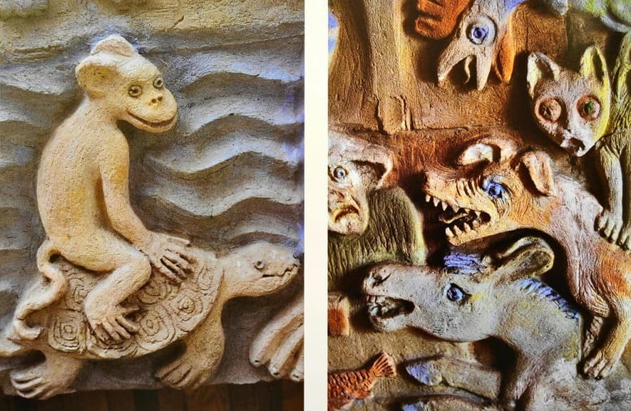 Починати огляд рельєфів можна з будь-якого місця, усюди перед нами постають знайомі персонажі. Ольга Рапай виявилася чудовим ілюстратором й зображення цілком відповідають нашому уявленню про казкових істот. Десь погляд зупиниться на героях слов’янського фольклору, як-от Івасик-Телесик, Микита Кожум’яка або Царівна-жаба. Поряд із ними — класичні сюжети західних казкарів, насамперед Шарля Перро і братів Грімм: Кіт y чоботях, Попелюшка, що їде на бал, Білосніжка та семеро гномів, Бременські музиканти… Легко впізнати й персонажів казок Ганса Крістіана Андерсена «Нове вбрання короля», «Кресало», «Дюймовочка», «Непохитний олов’яний солдатик» і «Свинопас». Широко представлені східні мотиви, зокрема казки «Тисячі й однієї ночі». Шехерезада розважає тут султана нескінченними історіями, а величезний джин лякає Аладдіна несподіваною появою біля чарівної лампи. Ходжа Насреддін неквапливо їде на віслюку. Кентавр, неначе на карті зоряного неба, відстрілюється від вовків… Розглядати цю скульптурну феєрію можна годинами, радіючи кожній знайомій постаті.